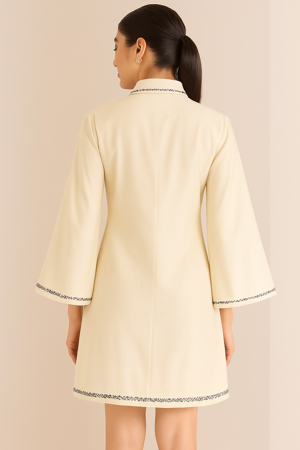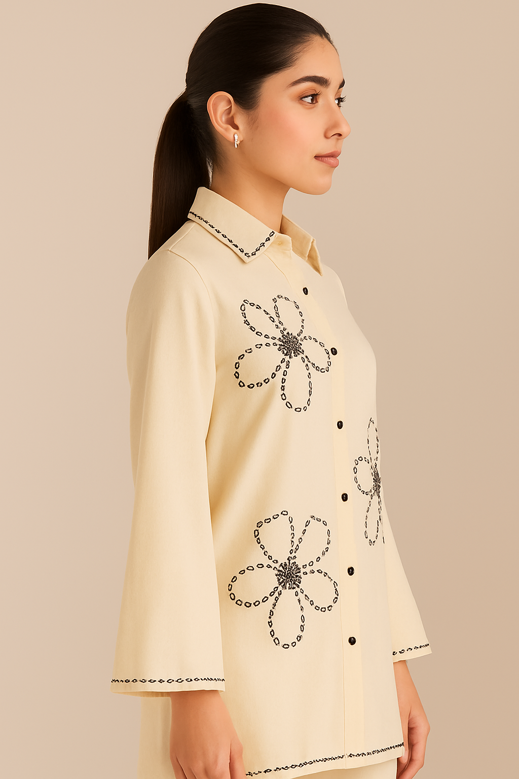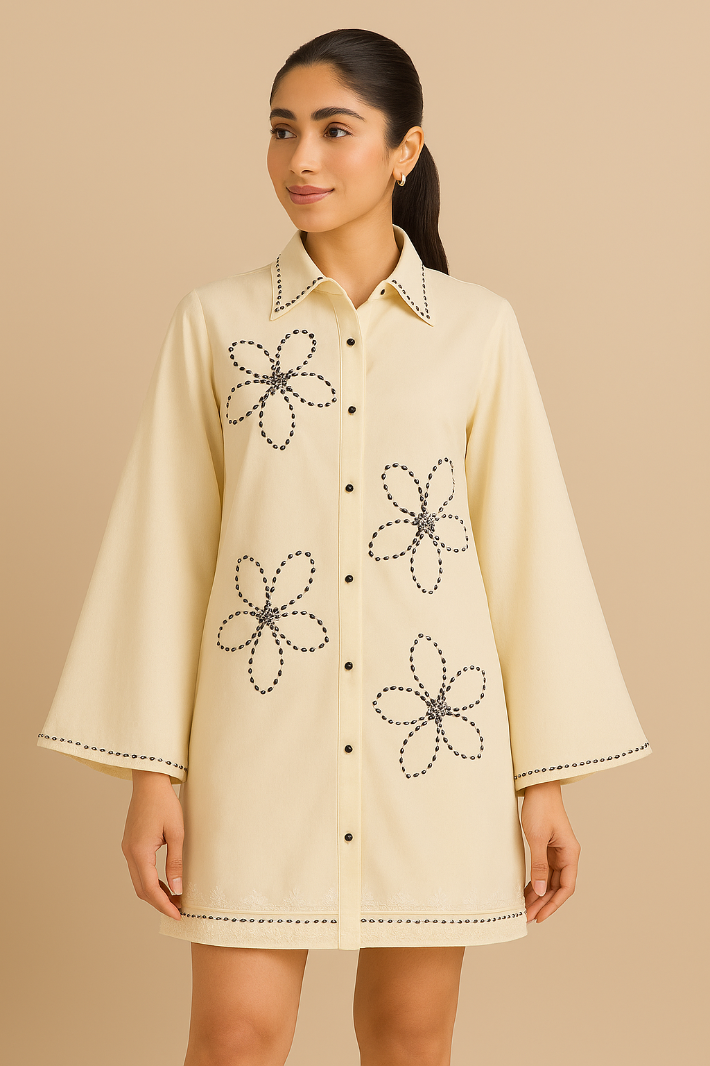 Let your style speak with our Bloom Stitch Beige Shirt Dress, a contemporary statement piece featuring oversized black floral embroidery and contrast stitch detailing. Made from structured yet breathable fabric, this A-line shirt dress boasts flared sleeves and button-down charm. Versatile enough to wear as a dress or a tunic—pair it with boots or flats for a confident, polished look. Where modern streetwear meets artisan-inspired detailing.