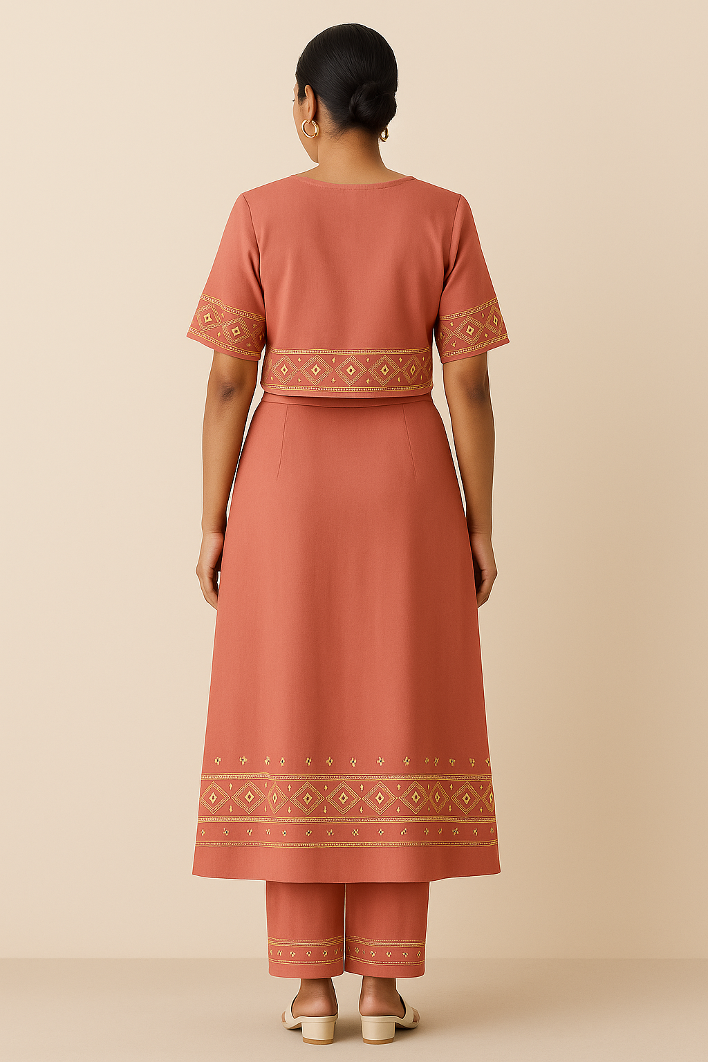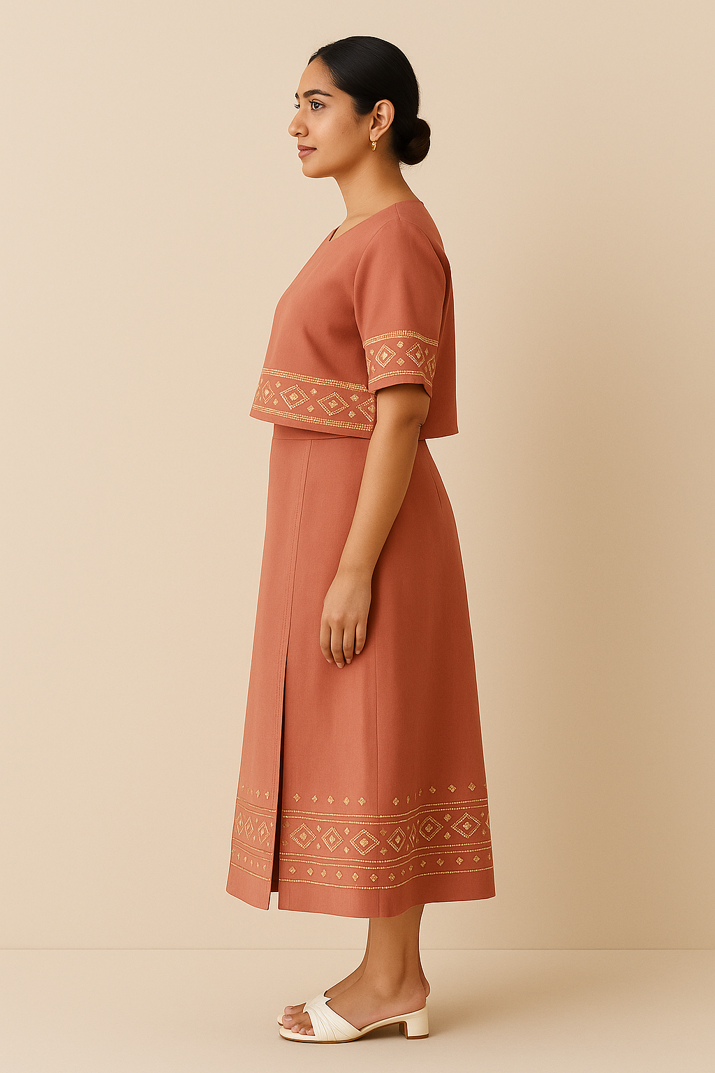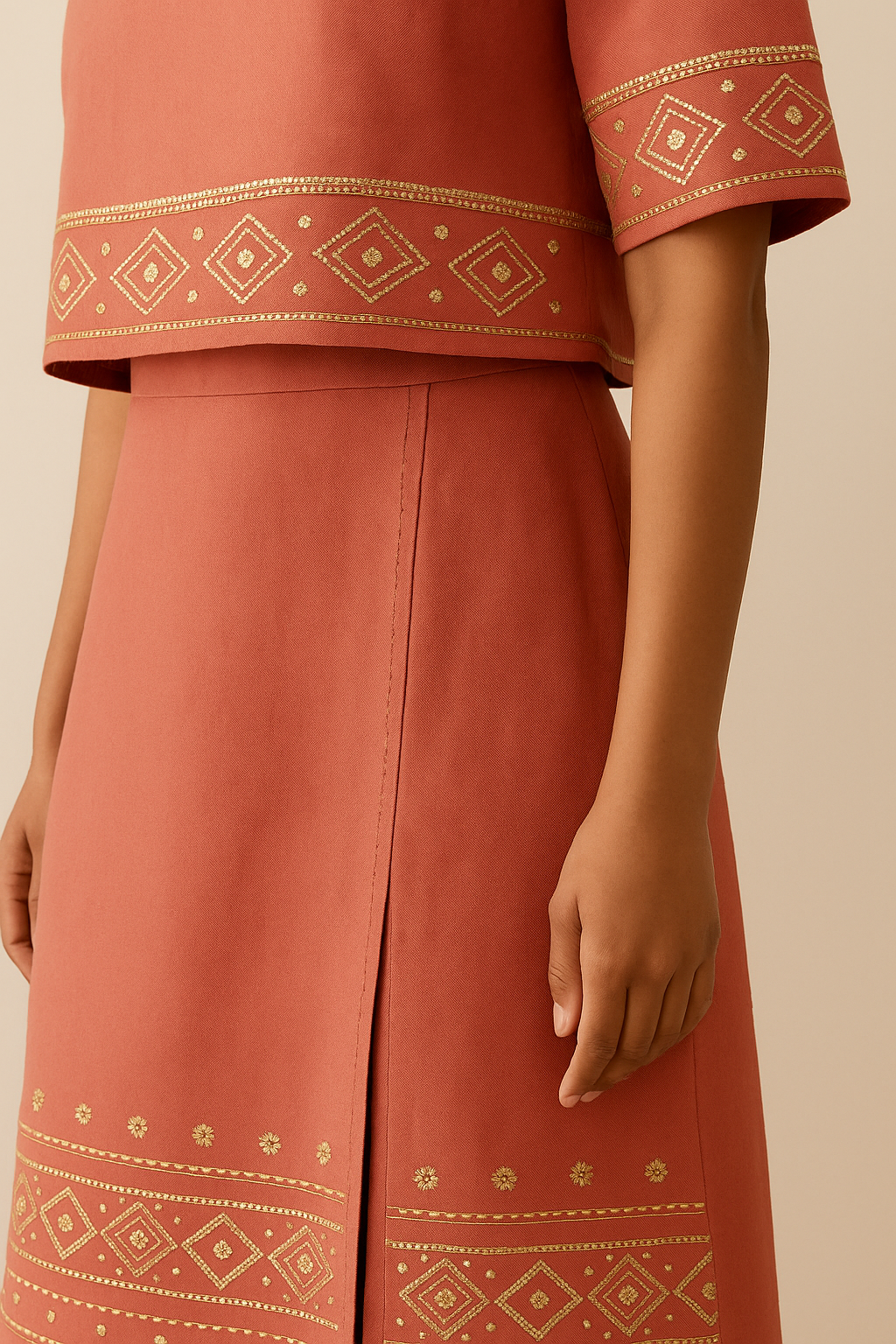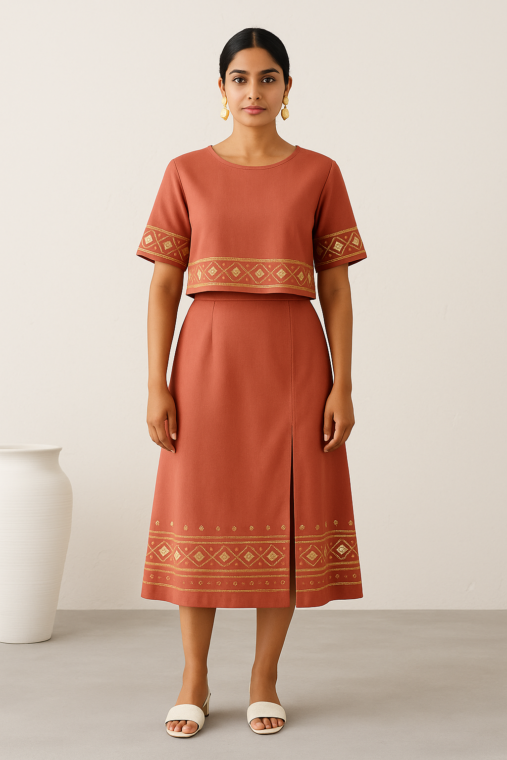 Both the top and skirt are adorned with geometric gold foil-printed borders, drawing inspiration from tribal and artisanal motifs. The earthy rust hue adds warmth and sophistication, making this set ideal for festive lunches, office events, or cultural evenings.