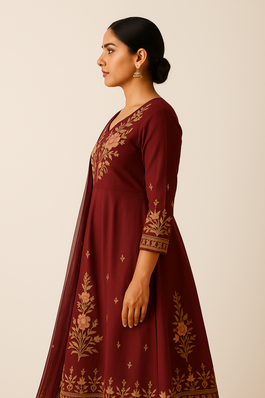 Immerse yourself in the richness of tradition with the Gulzaar Maroon Anarkali Suit Set. This deeply elegant ensemble features a flared silhouette adorned with resplendent floral embroidery in dull gold and soft peach tones. The intricate threadwork graces the yoke, hemline, and sleeves of the Anarkali, lending a heritage charm.